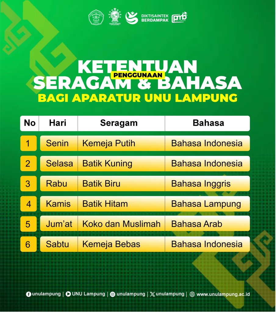 Dalam rangka meningkatkan disiplin, profesionalisme, serta tertib administrasi dan komunikasi di lingkungan Universitas Nahdlatul Ulama Lampung, dan menjalankan Instruksi Gubernur Provinsi Lampung Nomor 4 Tahun 2025 Tentang Kamis Beradat, pimpinan UNU Lampung telah menetapkan ketentuan penggunaan seragam dan bahasa bagi seluruh aparatur.