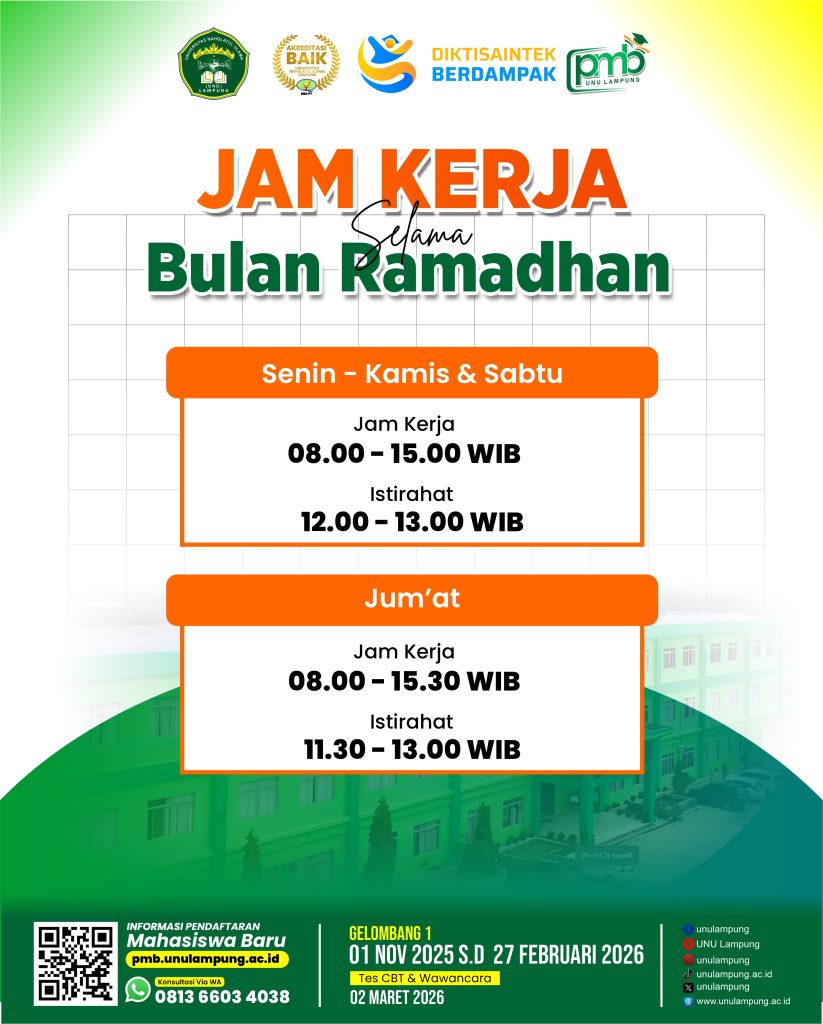 Edaran Penetapan Jam Kerja Selama Bulan Ramadhan 1447 H / 2026 M 14 Februari 202618 Februari 2026 unulampung Surat Edaran Cuti Bersama dan Penetapan jam Kerja Ramadhan 2026Unduh