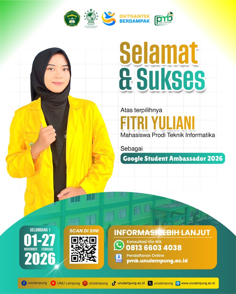 Fitri Yuliani Mahasiswa Program Studi Teknik Informatika Fakultas Sains dan Teknologi UNU Lampung resmi menyandang status sebagai Duta Teknologi Google melalui Pengumuman resmi disampaikan melalui email Google dan situs Google Student Ambassador tahun 2026. Dari ribuan pendaftar, Fitri Yuliani masuk 800 mahasiswa se-Indonesia yang dinyatakan lolos seleksi.