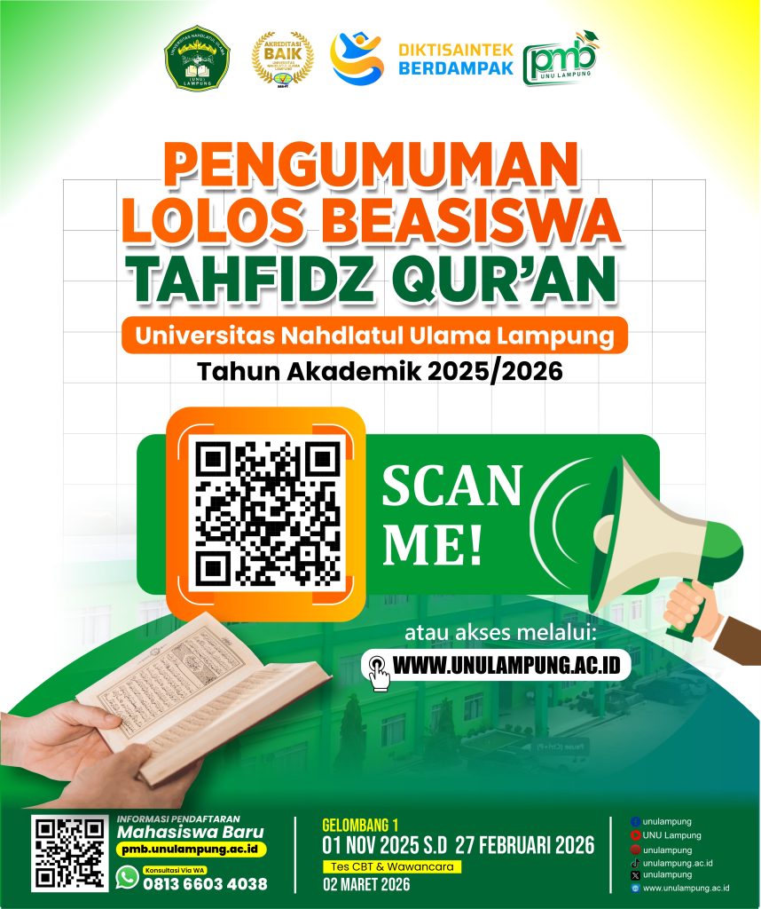 Berdasarkan hasil seleksi yang telah dilaksanakan oleh Tim Seleksi Beasiswa Tahfidz Al-Qur’an UNU Lampung, dengan ini kami sampaikan bahwa proses seleksi telah selesai dilaksanakan sesuai dengan ketentuan dan kriteria yang berlaku. Seleksi meliputi verifikasi administrasi, uji hafalan Al-Qur’an, serta penilaian kelayakan penerima beasiswa.