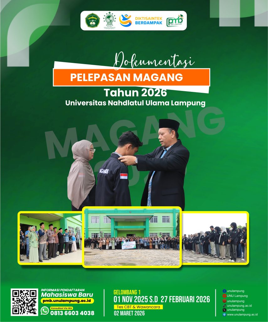 Lampung Timur (10/01/2026) – Universitas Nahdlatul Ulama Lampung menggelar acara pelepasan peserta magang Tahun 2026 yang berlangsung di Halaman Kampus UNU Lampung dengan dihadiri oleh Pendiri UNU Lampung, Rektor UNU Lampung, Ketua Pelaksana Program Magang, para dosen pembimbing, serta seluruh mahasiswa peserta magang.