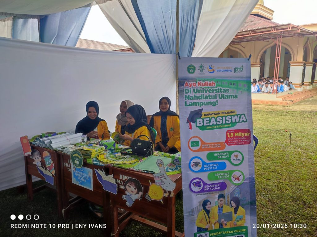 Tim Penerimaan Mahasiswa Baru (PMB) Universitas Nahdlatul Ulama Lampung turut berpartisipasi dalam kegiatan Campus Expo yang diselenggarakan di SMAN 1 Purbolinggo. Kegiatan ini menjadi wadah bagi para siswa kelas XII untuk mendapatkan informasi seputar perguruan tinggi dan pilihan studi lanjutan setelah lulus dari jenjang SMA.