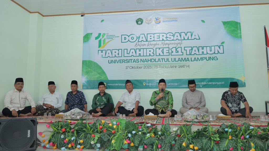 Dalam rangka memperingati Hari Lahir ke-11 Tahun, Universitas Nahdlatul Ulama Lampung menggelar kegiatan Doa Bersama yang berlangsung khidmat di Ruang Auditorium Lantai 3 pada Jumat, 17 Oktober 2025. Acara ini dihadiri oleh Rektor dan jajaran pimpinan universitas, dosen, tenaga kependidikan,serta para tokoh pendiri UNU Lampung dan Pengurus BPP Periode 2021-2025.
